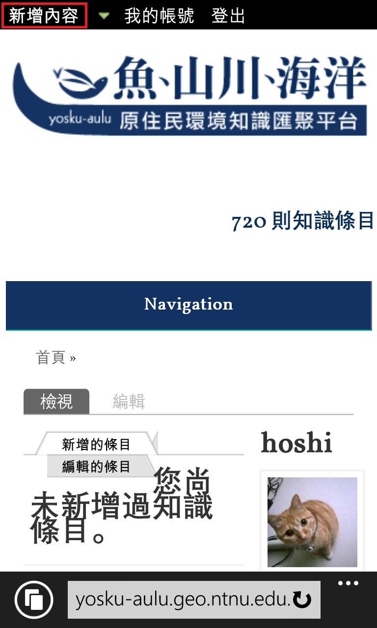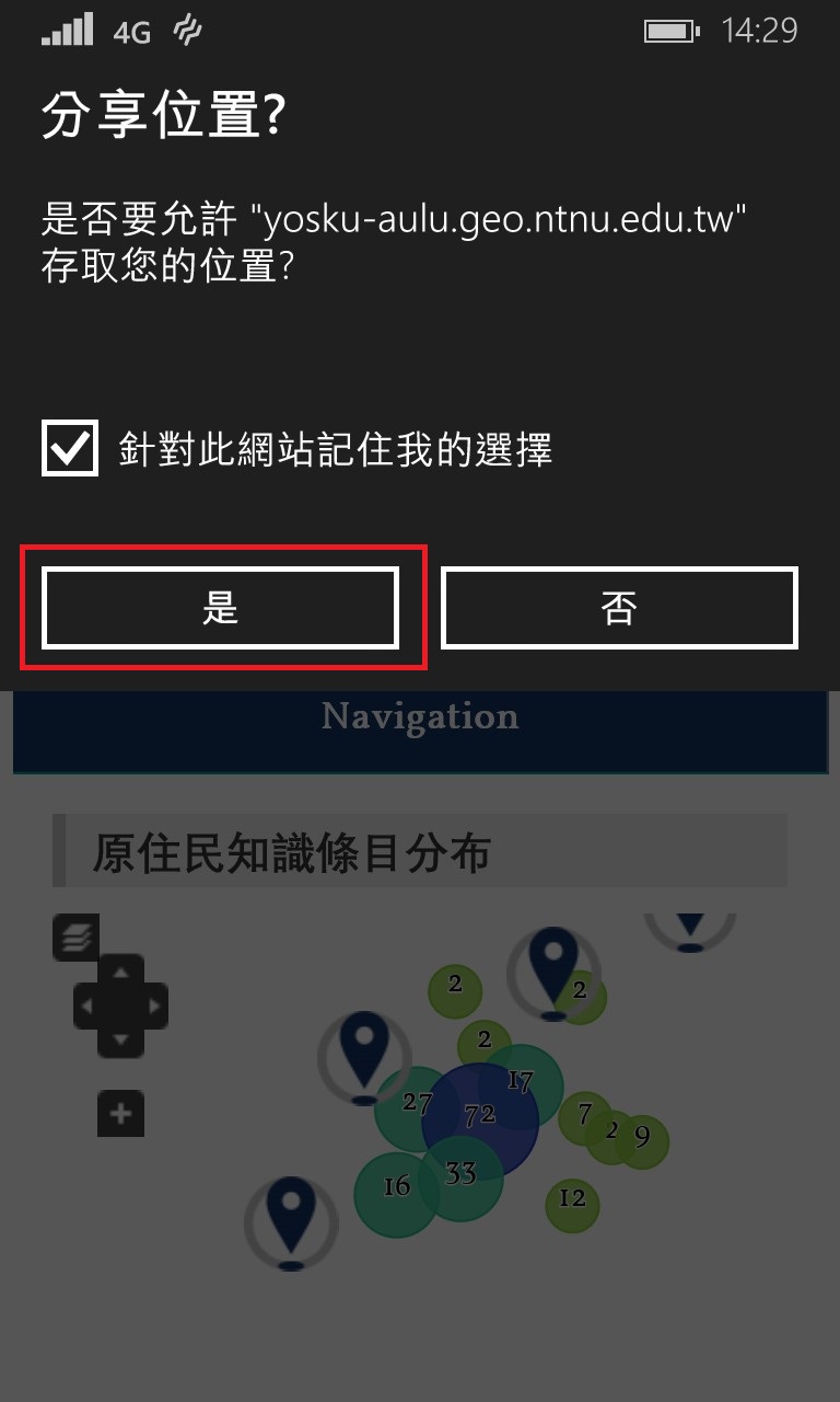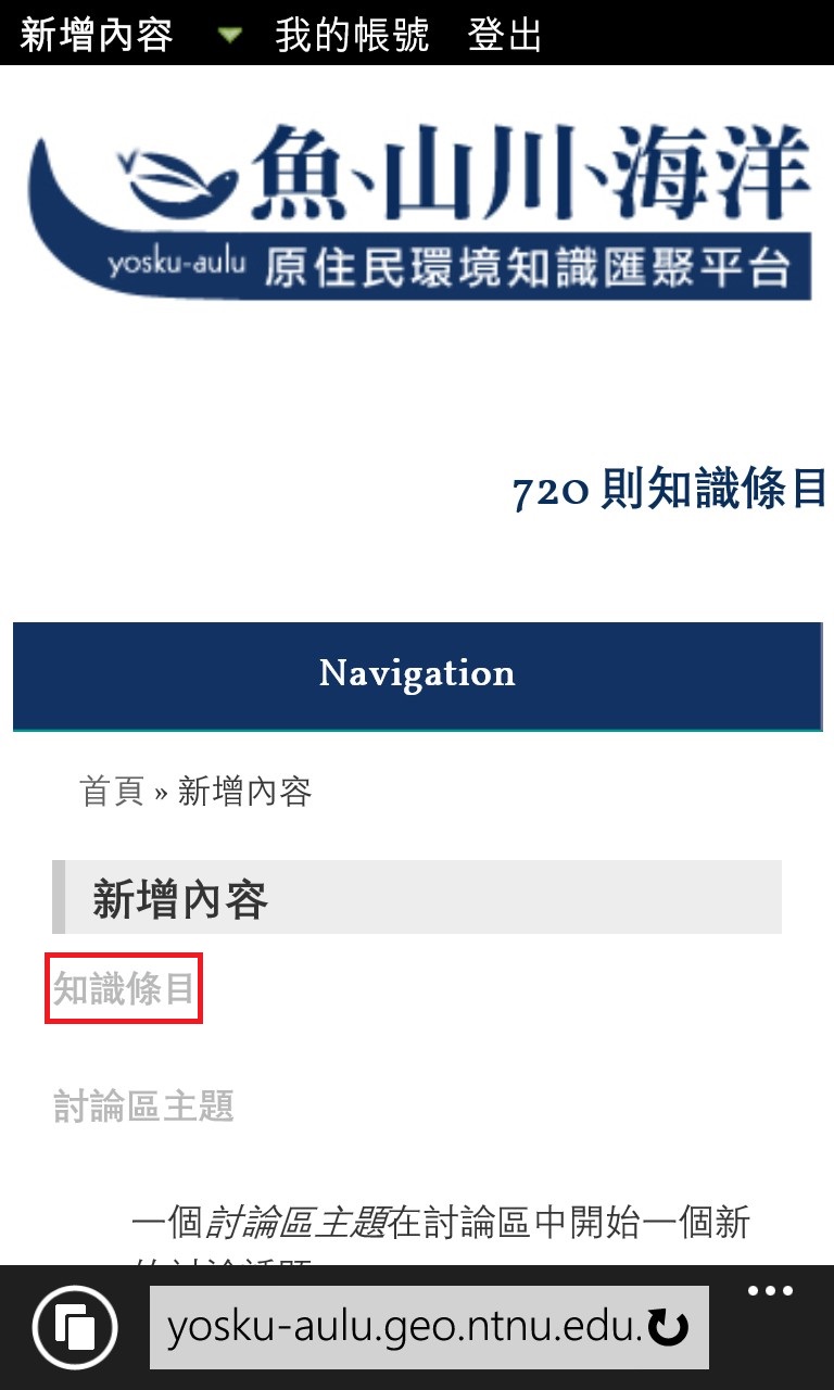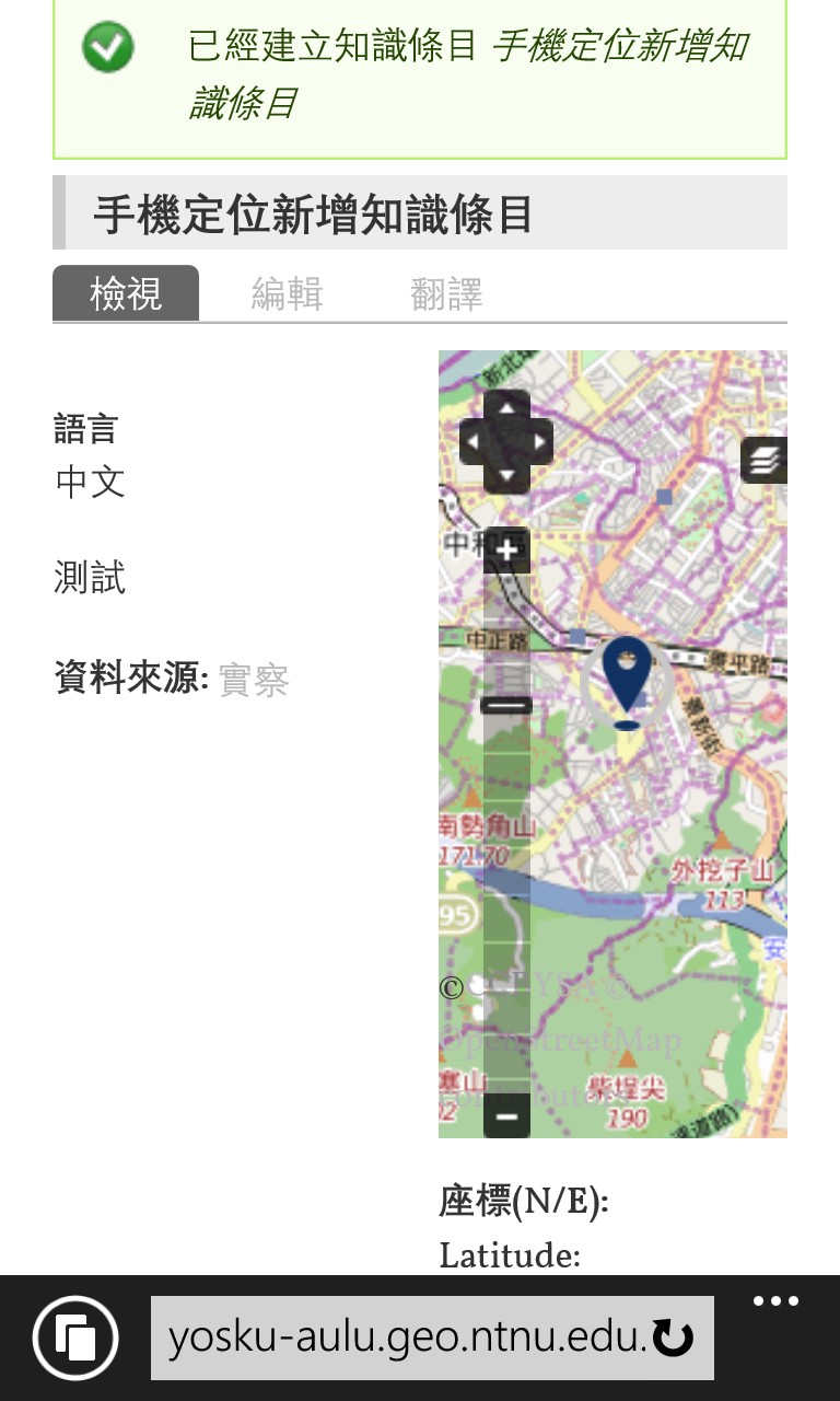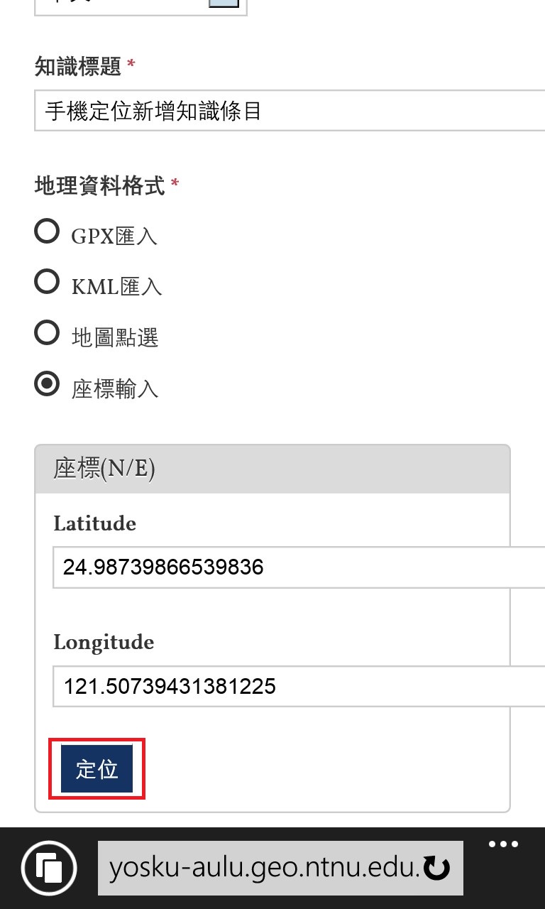 本系統在您使用行動裝置時,會詢問您是否同意讓系統獲取您行動裝置的所在位置,點選同意後會將位置記錄在座標欄位,即可新增知識條目!